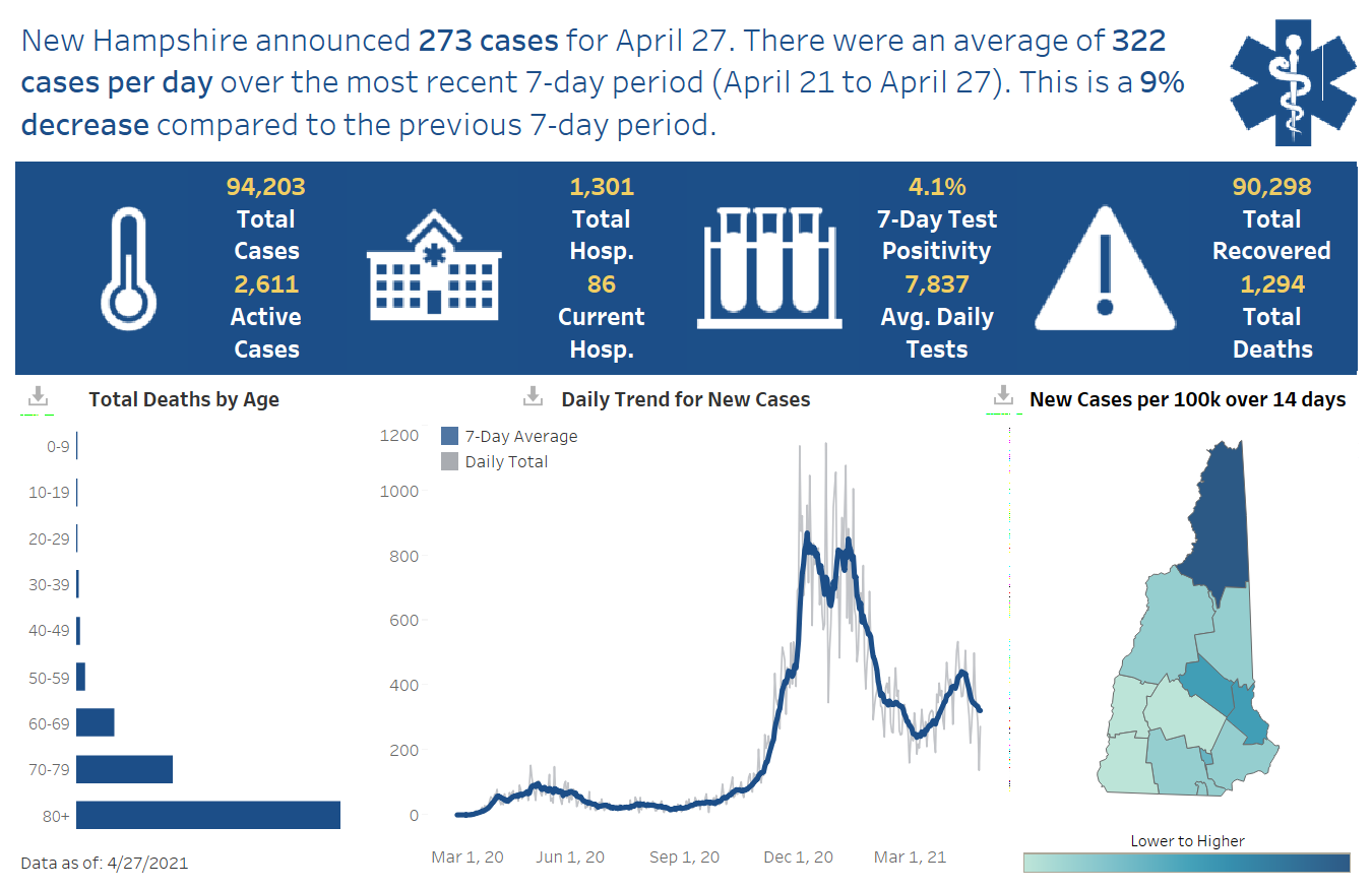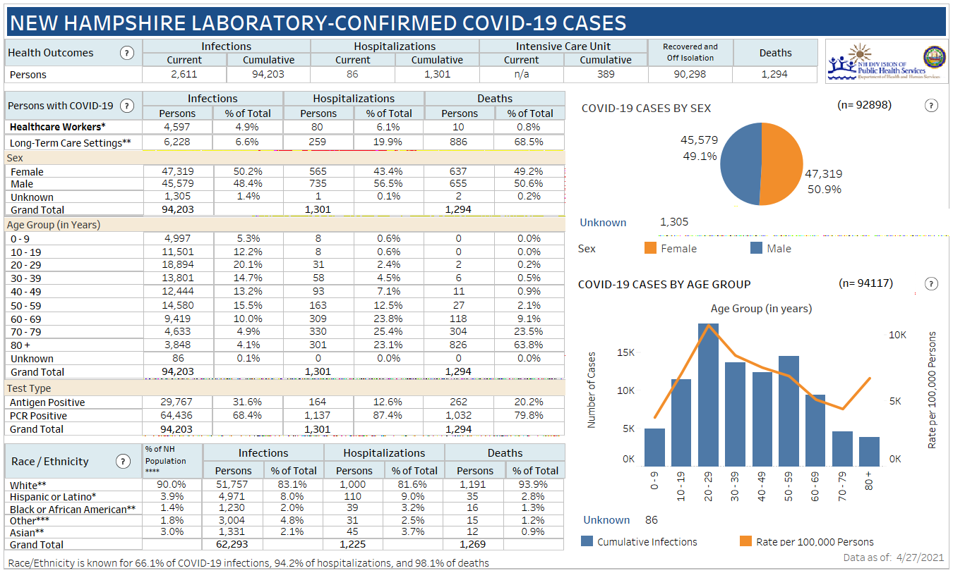 ย New Hampshire 2019 Novel Coronavirus (COVID-19) Summary Report (updated April 27, 2021, 9 a.m.)
