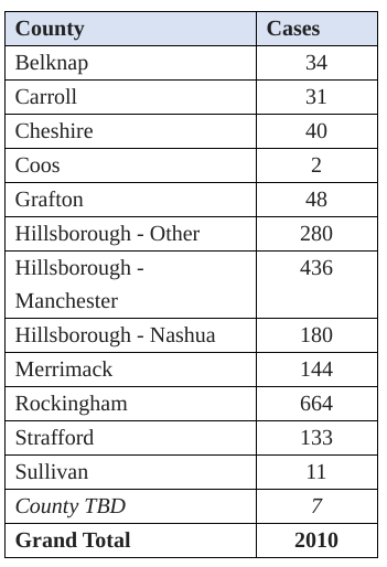 CONCORD, NH โ On Tuesday, April 28, 2020, DHHS announced 82 new positive test results for COVID-19. There have now been 2,010 cases of COVID-19 diagnosed in New Hampshire. Several cases are still under investigation. Additional information from ongoing investigations will be incorporated into future COVID-19 updates.