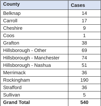 CONCORD, NH โย On April 3, 2020, DHHS announced 61 new positive test results for COVID-19. There have now been 540 cases of COVID-19 diagnosed in New Hampshire. The new cases are 40 adult females and 21 adult males.