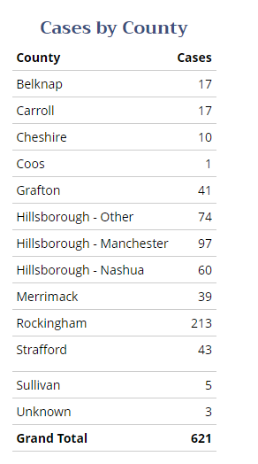 CONCORD, NH โ On Saturday, April 4, 2020, DHHS announced 81 new positive test results for COVID-19. There have now been 621 cases of COVID-19 diagnosed in New Hampshire.