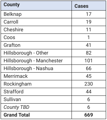 CONCORD, NH โ On Sunday, April 5, 2020, DHHS announced 48 new positive test results for COVID-19. There have now been 669 cases of COVID-19 diagnosed in New Hampshire. Several of the new cases are still under investigation.