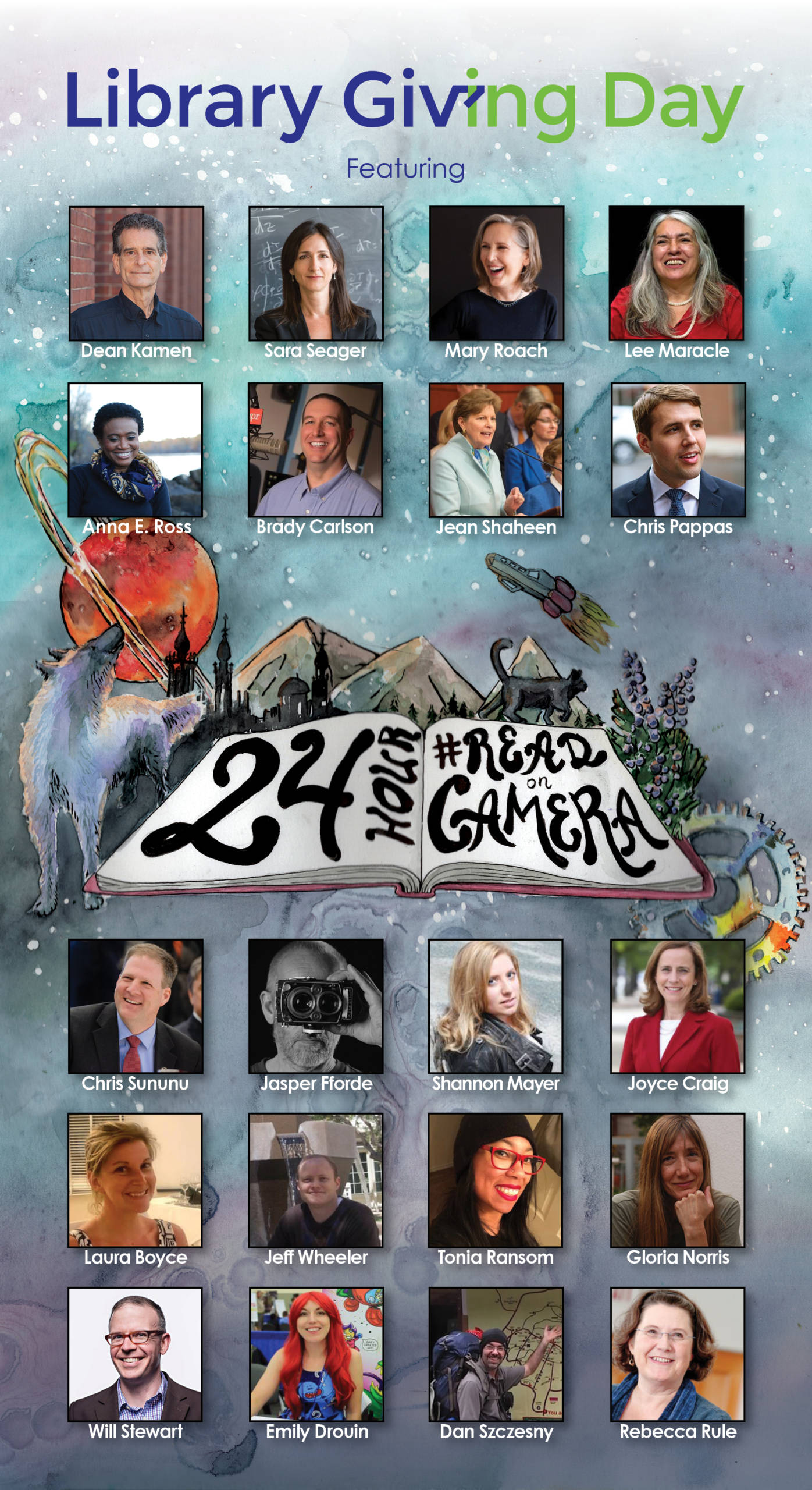 #ReadonCamera Library Giving Day will be a new online take on the traditional read-a-thon. For 24 hours, beginning at midnight with local Manchester author Dan Szczesny, and running throughout the day on April 7, political figures, local and nationally known authors, media personalities, and other people of note will read on camera in 15-minute increments.ย