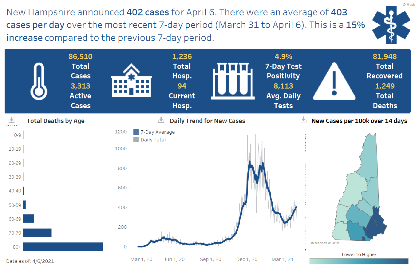CONCORD, NH โ On Wednesday, April 7, 2021, DHHS announced 434 new positive test results for COVID-19, for a current PCR test positivity rate of 2.5%. Todayโs results include 258 people who tested positive by PCR test and 176 who tested positive by antigen test. There are now 3,387 current COVID-19 cases diagnosed in New Hampshire.