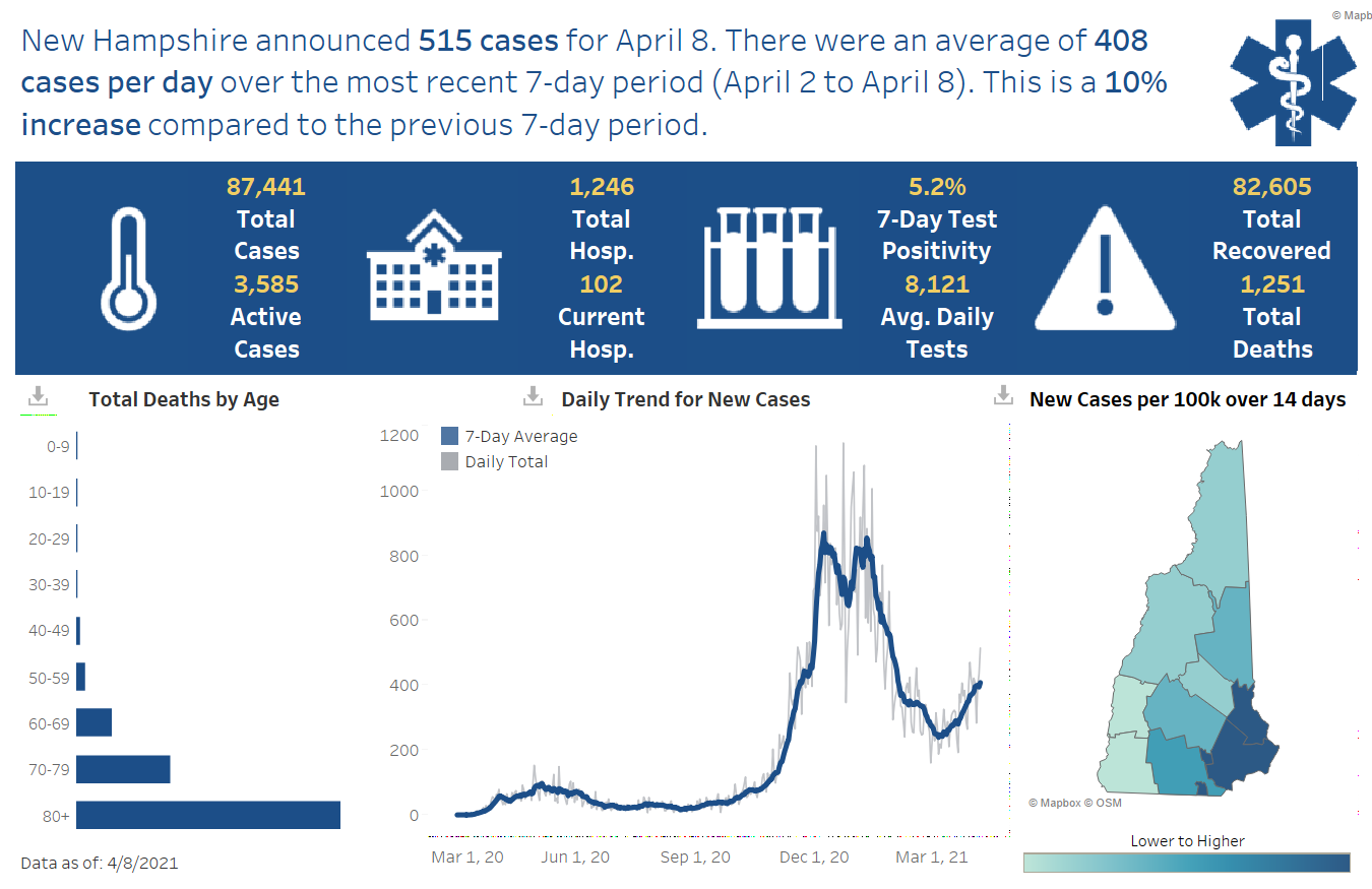 ย New Hampshire 2019 Novel Coronavirus (COVID-19) Summary Report (updated April 8, 2021, 9 a.m.)