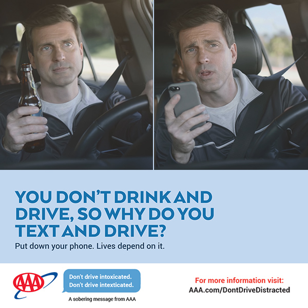 “Don’t Drive Intoxicated – Don’t Drive Intexticated” is the theme of AAA’s multimedia traffic safety education campaign created to make distracted driving socially unacceptable. New public service announcements (PSAs) are designed to help audiences understand that the consequences of using a smartphone while driving are the same as drinking and driving. The campaign targets drivers who would never consider drinking a beer behind the wheel, and yet, regularly engage with mobile devices that dangerously take their eyes, hands and minds off the road.