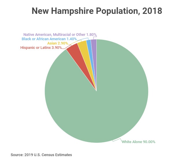 Hispanic or Latino residents make up the largest portion of the state’s total minority population at 4 percent, according to 2019 census estimates, followed by Asian residents at 3 percent and Black or African American residents at 1.8 percent. About 2 percent of Granite Staters are Native American, multiracial or another race.