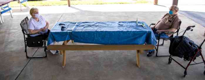 Navy veteran Gregory Couture talks with his wife, Celeste, while social distancing at the outdoor pavillion at the New Hampshire Veterans Home in Tilton on Thurday, July 16,2020. It was the first time the couple had seen each other outdoors since the COVID-19 pandemic. Photo/Geoff Forester
