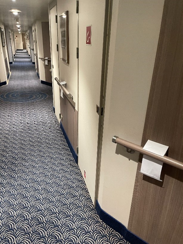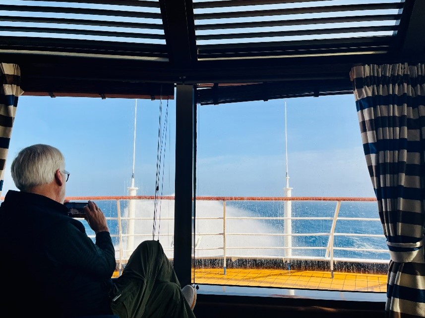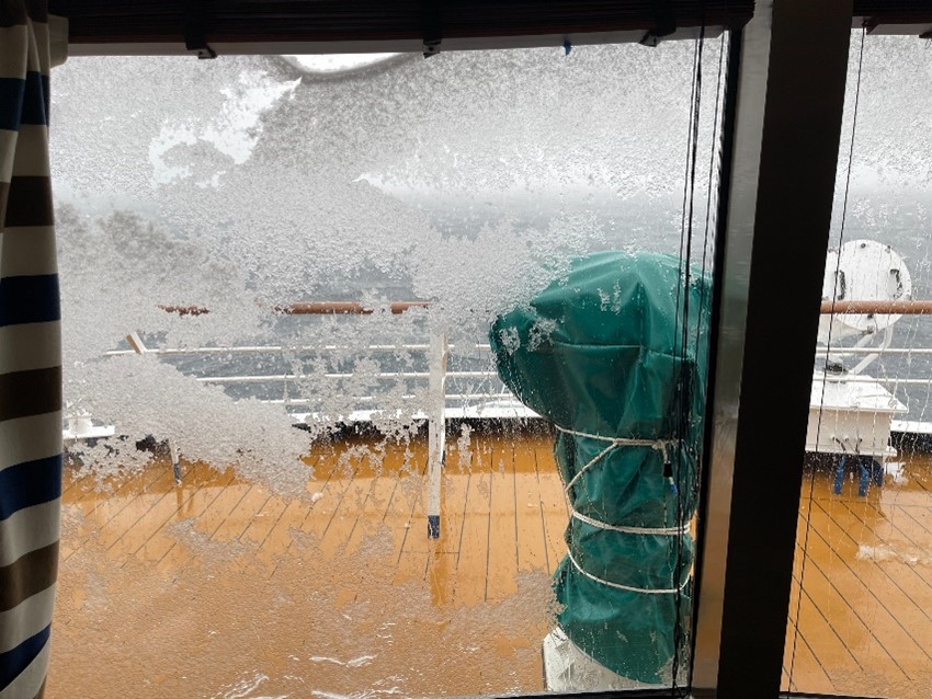 Anyone walking anywhere had to keep โone hand for the ship,โ grabbing railings and furniture to stay upright (it did make it look like a ship of drunks, which I should have captured on video), and barf bags were distributed along all the rails on each deck.ย Seats at dinner were easy to come by and plates and glasses would occasionally go sliding off tables with a great crash.ย Some of the crew who had done multiple crossings said that was one of the worst (a week earlier, a sister ship did the Drake in a massive storm with 100-knot winds and was โhammered,โ to use our captainโs technical term). Itโs easy to see why the Drake is legendary.