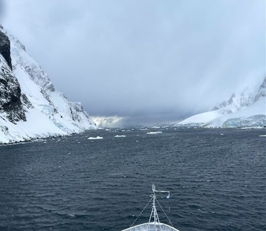 We navigated the Lemaire Channel, sometimes called Kodak Canyon, it is so narrow and picturesque, with a howling 50-knot wind and icebergs all around us, and the sharp-sided peaks shrouded in fog.ย We rode zodiacs through newly broken-up pack ice, gliding between icebergs at water level. Visiting a penguin colony in a blizzard, my iPhoneโs interface so slowed in the icy cold that I held a hand warmer to the back of it. I also put foot and hand warmers in my boots and gloves before leaving the ship.ย The weather is its own dramatic character in the play that is Antarctica; some would argue the protagonist.