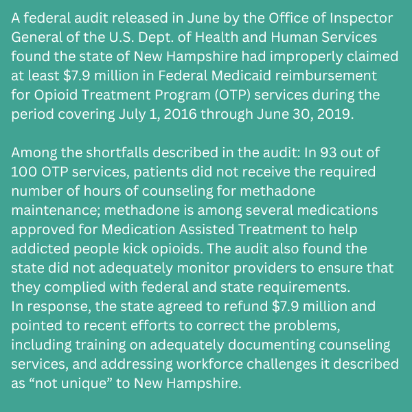 (A federal audit released in June by the Office of Inspector General of the U.S. Dept. of Health and Human Services found the state of New Hampshire had improperly claimed at least $7.9 million in Federal Medicaid reimbursement for Opioid Treatment Program (OTP) services during the period covering July 1, 2016 through June 30, 2019.