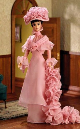 The Beaton touch is clearly evident in each production, where he was involved, including Gigi, starring Leslie Caron, of which he would win an Academy Award and On A Clear Day You Can See Forever, starring Barbara Streisand, both of which were directed by Vincente Minnelli.ย Beatonโs costuming simply put is nothing less than stunning, so much so that his fashion sense consistently envelopes each scene. In My Fair Lady, he paid special attention to accentuate Hepburnโs long neck and slender body. As a testament to Beaton’s artistry, regarding her iconic ball gown, in the famous scene where she reveals herself at the top of the staircase, Hepburn recalls walking down the stairs in such refined elegance, stating of the dazzling dress, โIt made me do it.โย Beaton knew how to delicately yet commandingly emphasize the female form, and this is most evident in the posh black-and-white pretentious, pastiche, pageantry of the Ascot Racecourse scene. The millinery craftsmanship alone is outstanding, far less the terribly chic costuming. Most actresses are garbed in black-and-white gowns while the men are cloaked in grey-and-white suits. Select actresses are accented in muted cool shades, including Mrs. Higgins. Eliza is the only character with accents of bright color, in clear delineation. Beatonโs My Fair Lady costumes became so iconic, a line of Barbie dolls was clothed in the designerโs most famous creations from the movie.