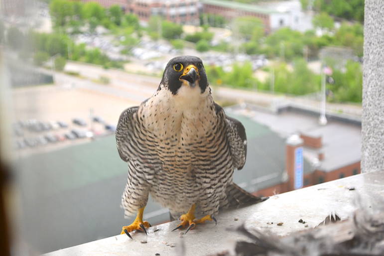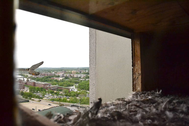 People from all over the world watch the falcons hatch, grow, feed and fledge through high-definition cameras linked to a live stream available on YouTube with the technical assistance of Bedford tech firm Single Digits.
