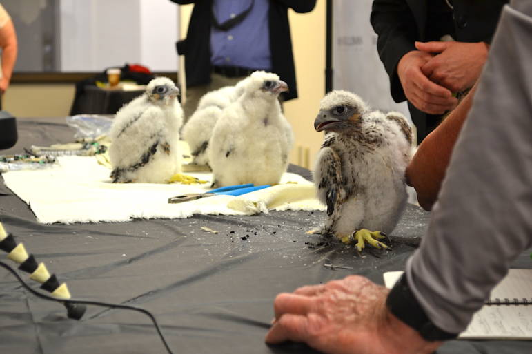 MANCHESTER, NHย โ About 30 members of the public watched from the edge of their seats Tuesday morning as New Hampshire Audubon biologist Chris Martin applied bands to the legs of four peregrine falcon chicks, also known as eyasses.