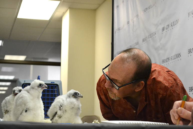 Contrary to common belief, parents of chicks will not abandon them after being touched by human hands. In fact, the parents, while understandably upset during the absence of their eyasses, fed them again by 2 p.m. Tuesday, shortly after they were returned to the nest. The banding process took about an hour.