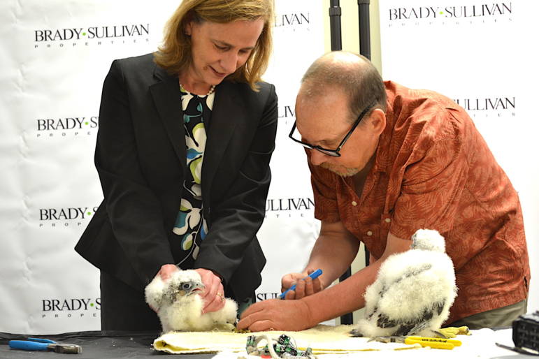 The nest on the Brady Sullivan Tower has produced 54 successfully-fledged falcons, each banded by Audubon.
