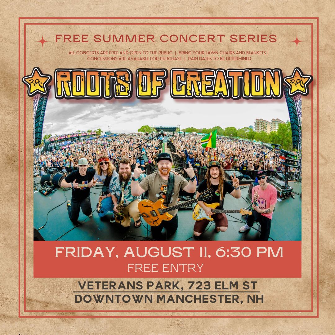 MANCHESTER, NH – Billboard and radio chart-topping, award-winning, international reggae-rock sensation Roots of Creation, are a touring powerhouse and they’re coming to Veterans Park for a FREE concert August 11 at 6:30 p.m. and everyone’s invited.