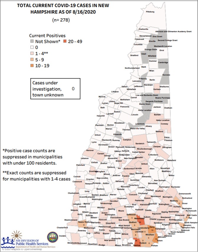 CONCORD, NH โ€“ On Sunday, August 16, 2020, DHHS announced 8 new positive test results for COVID-19. There have now been 6,988 cases of COVID-19 diagnosed in New Hampshire. Several cases are still under investigation. Additional information from ongoing investigations will be incorporated into future COVID-19 updates.