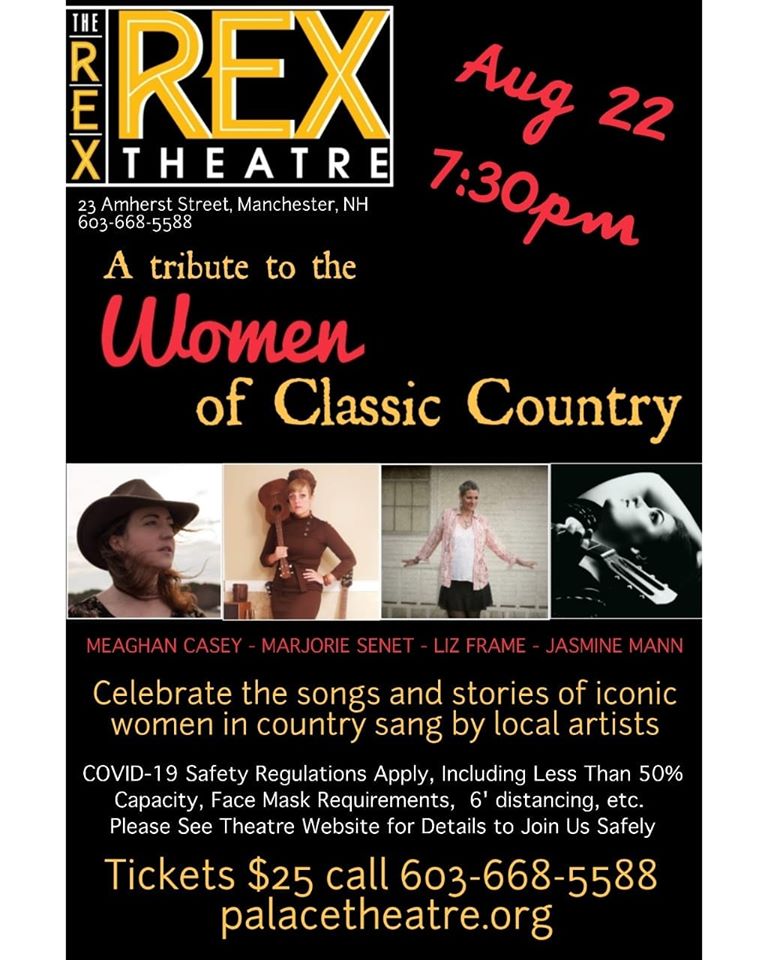 Jasmine Mann, Marjorie Senet, Meaghan Casey and the revered Liz Frame, leading boss of the legendary Kickers, all will take the stage simultaneously this Saturday night at the Rex Theatre at 7:30 p.m. Each will trade stories and songs back and forth and talk about the influence “classic country” music has had on their lives and careers. It’ll be like a big living room show, safely nuzzled into a nest of cautious confinement in downtown Manchester.