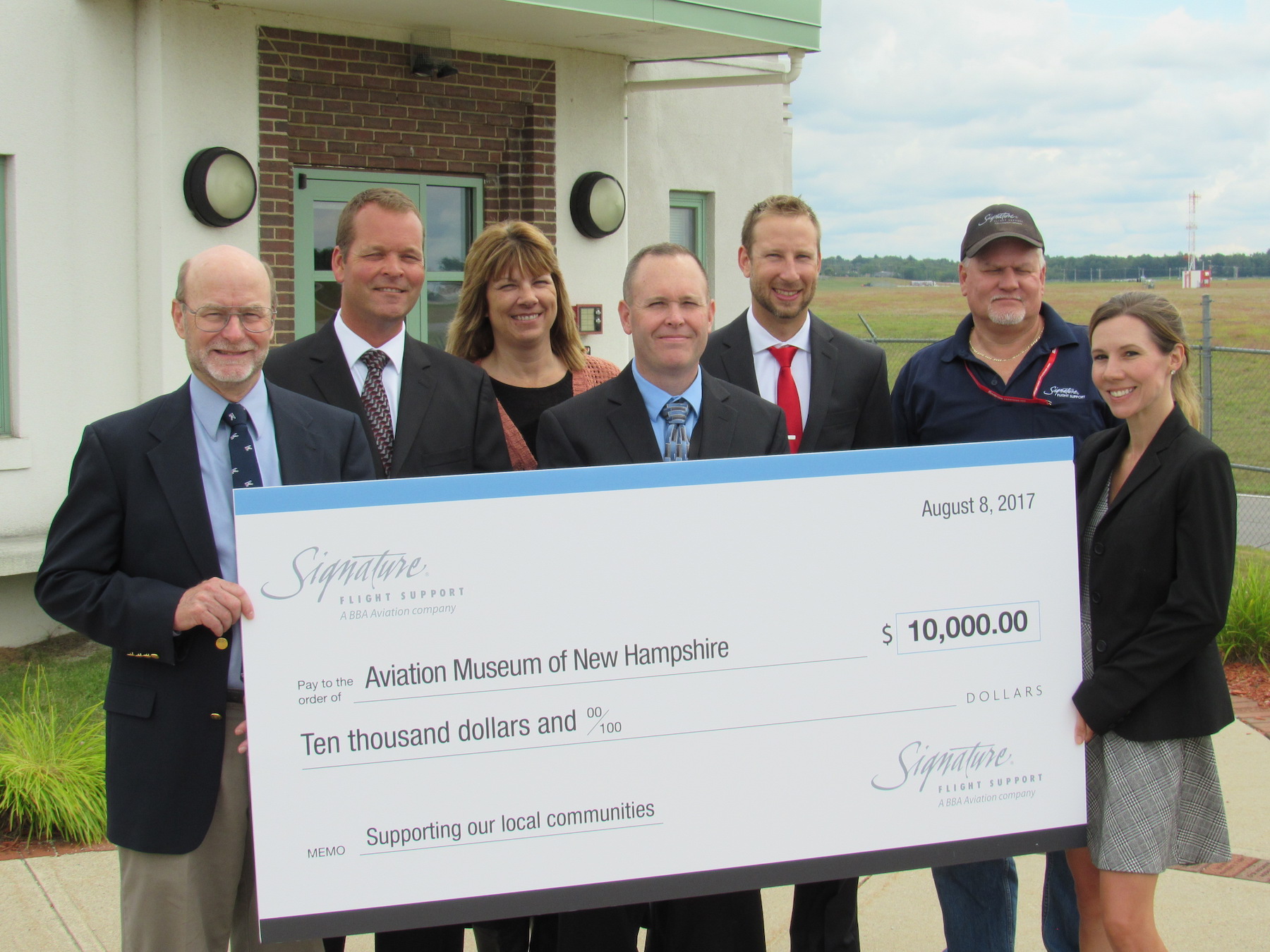 From left: Robert Hough, Board of Directors President, Aviation Museum of NH; staff from Signature Flight Support in center โ€“ Andy Kazakis, Sherry Battle, Josh Nehiley ,General Manager, Tim Chrzaszcz, Brian Pollack; Jessica Pappathan, Executive Director, Aviation Museum of NH.