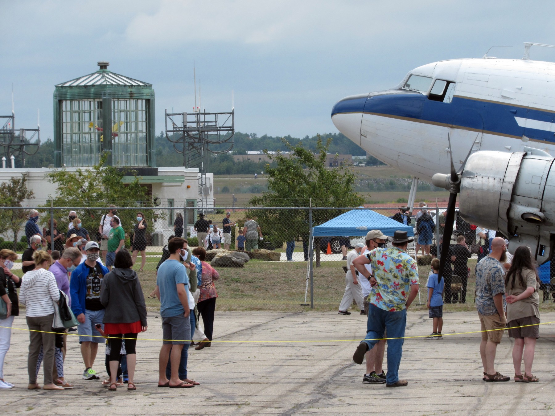 Volunteers guide visitors onto the ramp for close-up views of a vintage DC-3 airliner at the Aviation Museum of New Hampshire.