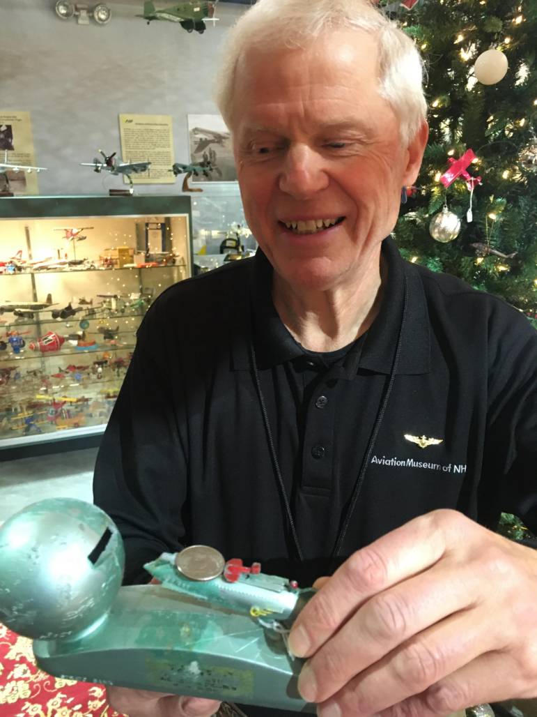 Volunteer Chuck Poltack handles a vintage spaceflight-themed children’s savings bank produced in the 1960s by the Colorado Savings & Loan Co. of Denver, Colo., part of the Aviation Museum of New Hampshire’s first-ever holiday ‘Festival of Toy Planes.’ Courtesy Photo