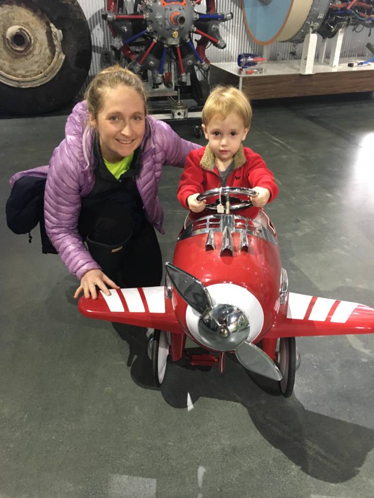 Kristen Ratanatharathorn of Bedford helps her son Han try out a pedal planes, part of the ‘Festival of Toy Planes’ on display at the Aviation Museum of New Hampshire. Courtesy Photo