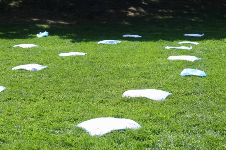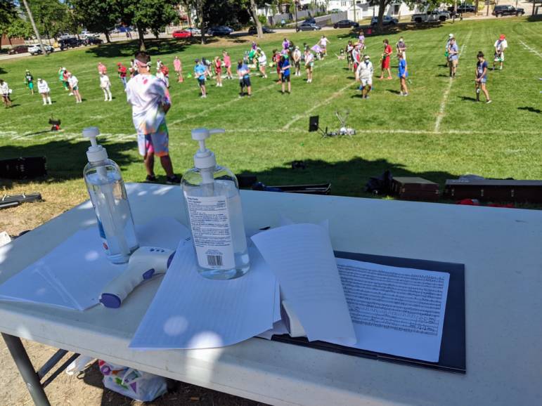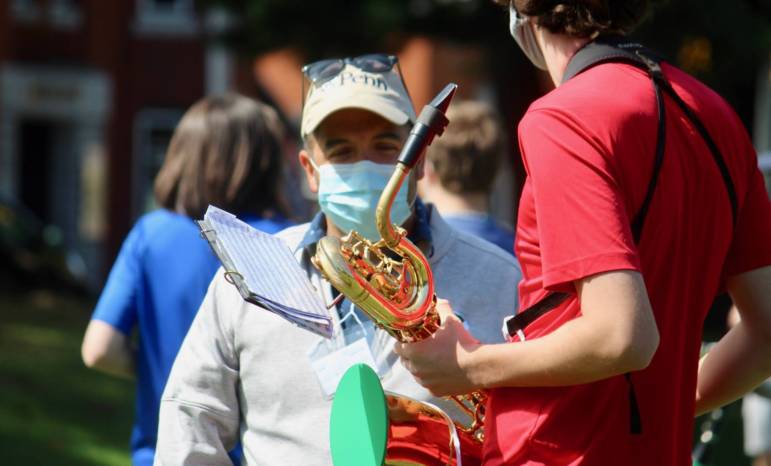 “I’m grateful our superintendent allowed this to happen,” said Colby, referring to letting clubs regroup while abiding by safety precautions. A table near the sidewalk where students check in each morning features hand sanitizer and an electronic thermometer. Puppy pads were spread out to safely collect spittle from the draining of the wind instruments.