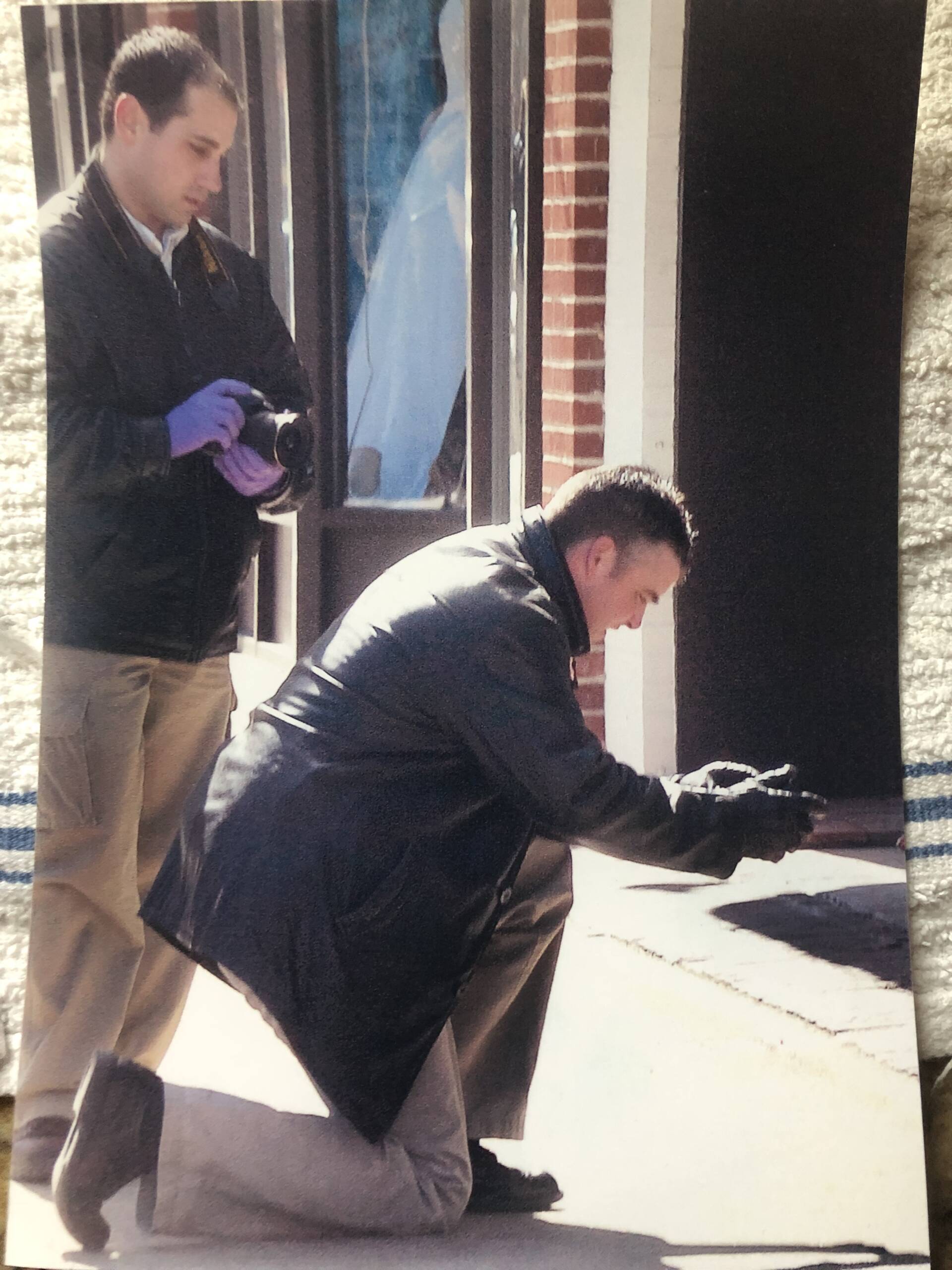Bob Freitas, kneeling, taking photos of evidence at the scene of a robbery with then Det. Carlo Capano, left, who would later become chief. Courtesy Photo