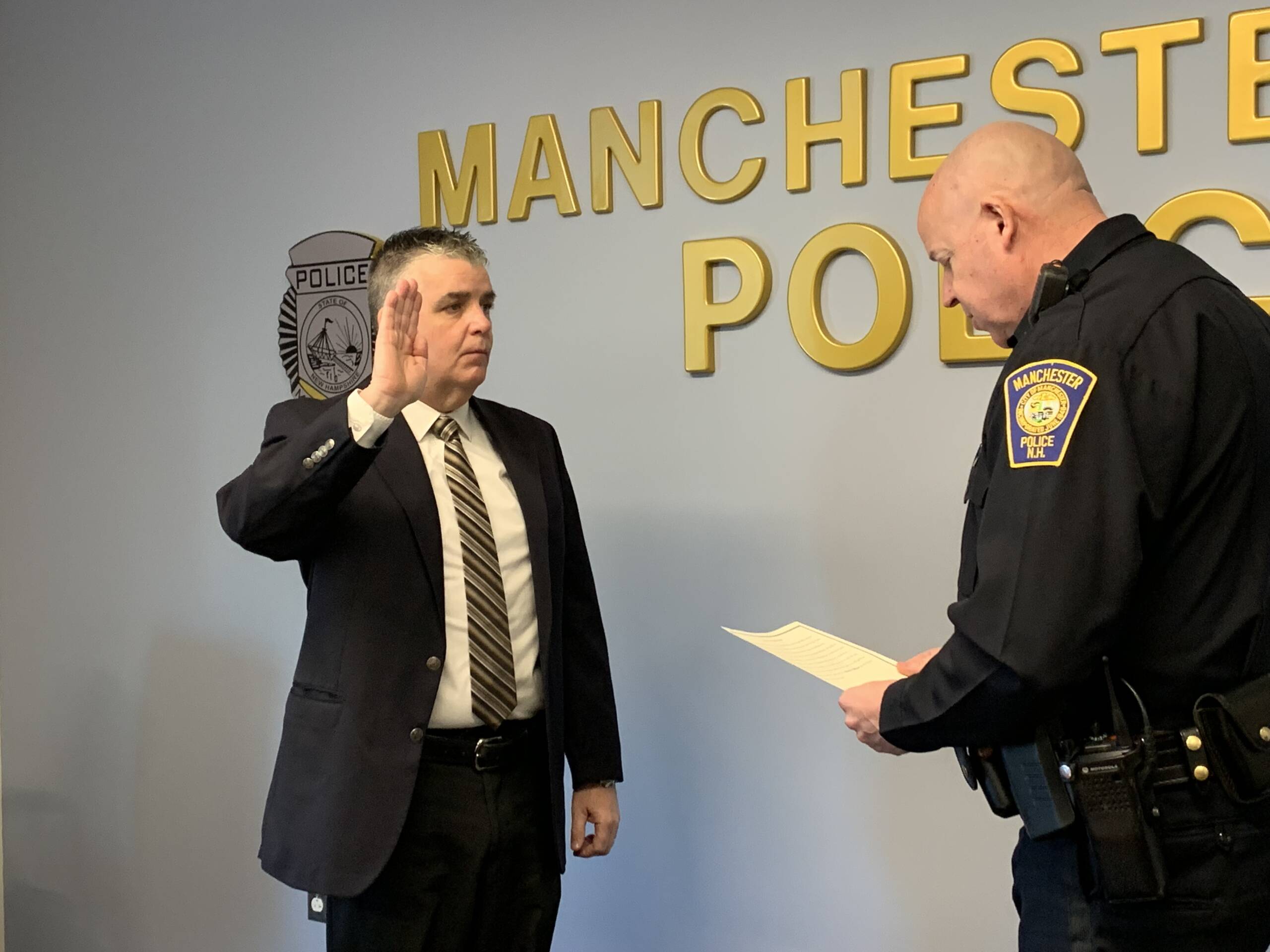Manchester Police Chief Allen Aldenberg, right, swears in retired detective Bob Freitas to return to Manchester Police as a reserve officer. Photo by Ryan Lessard