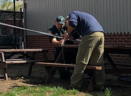 New Hampshire Fish and Game Conservation Officer Chris McKee responded to the scene and eventually captured the bear. The bear, which weighed about 115 pounds, was safely transported to the Lakes Region area of the State so it can thrive in the wild.