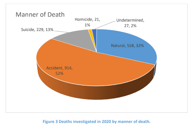 In 2020, for example, according to the office’s annual report, the breakdown was as follows: Of 1,749 deaths investigated, 52 percent were fatal accidents (which includes unintentional overdoses), 32 percent were natural deaths, and 13 percent were suicides. Around 1 percent were ruled homicides and 2 percent were undetermined. The office conducted 587 autopsies that year.