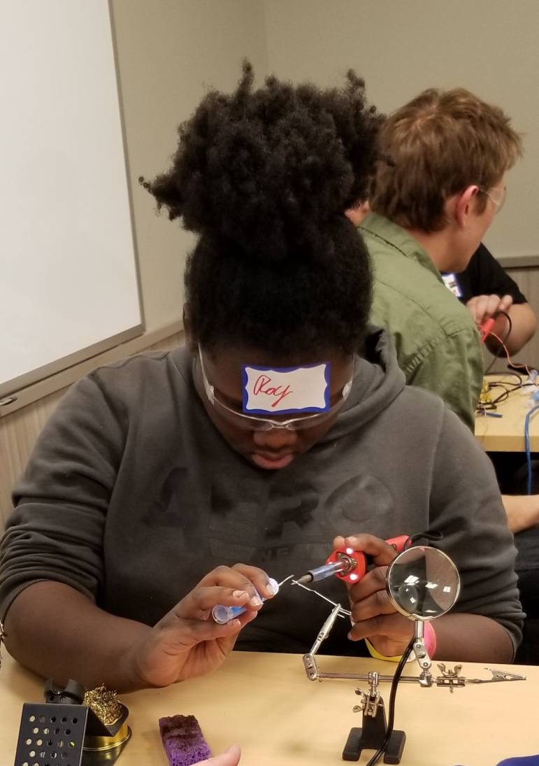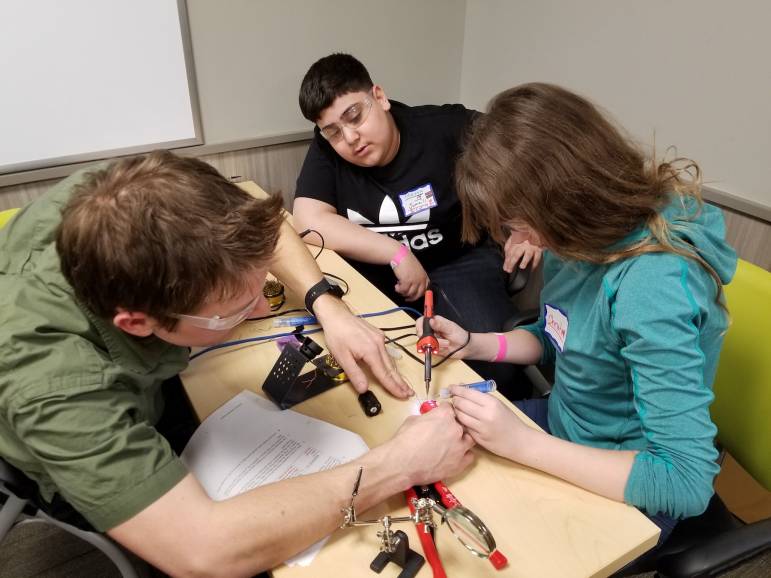 Students learn to solder with one of the STEM Lab’s advisory board members. Courtesy Photo