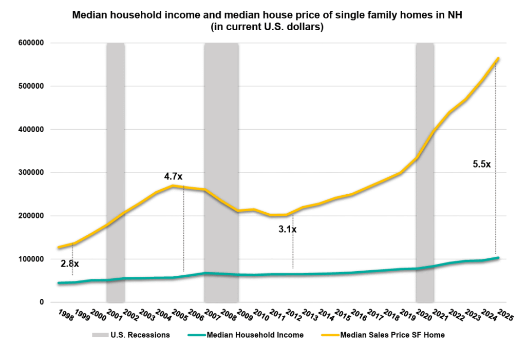 The June median sale price for a home in the state at $565,000, about 5.5 times the state’s median income, NH Housing Executive Director Rob Dapice said. [Median means that half sold for more, half for less; the year-to-date median sales price in New Hampshire as of September was $540,000, according to the New Hampshire Association of Realtors].