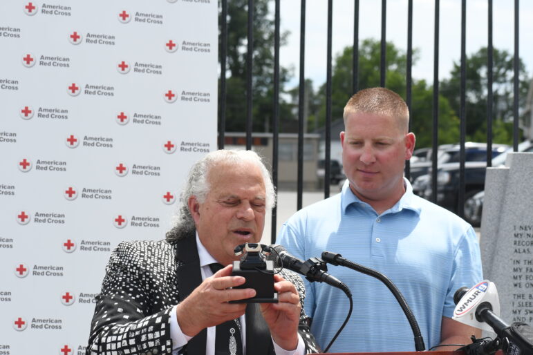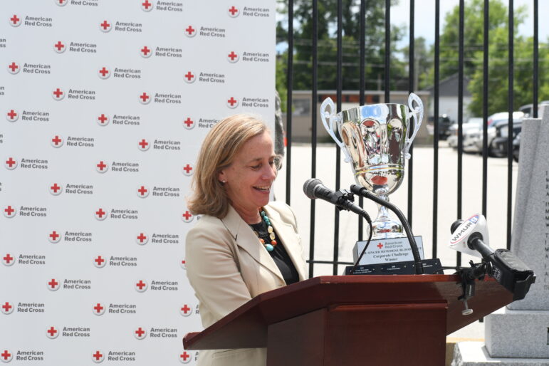 Gail Singer Memorial Blood Drive Co-Chair Stephen Singer honored Doherty with a small telephone trophy for his answering the call, as well as honoring Manchester Mayor Joyce Craig with a trophy to celebrate the City of Manchester’s victory in a competition of organizations last year to see who could donate the most blood.