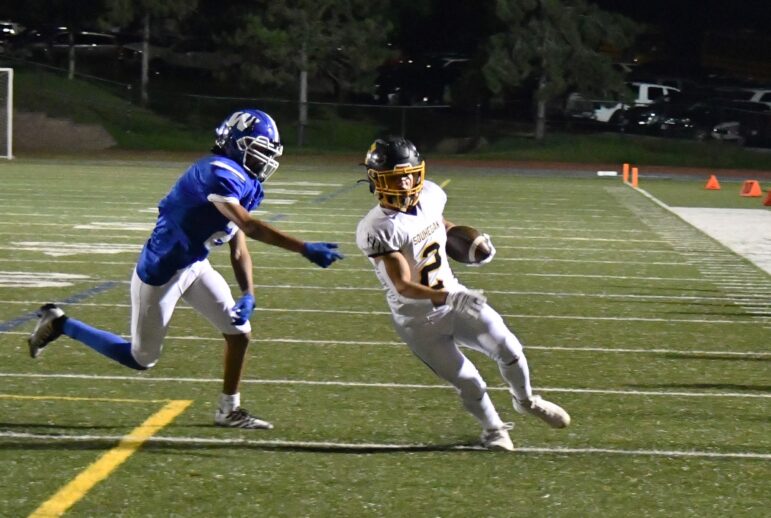Roughly halfway through the first quarter, junior Romy Jain connected with senior Cole Manning from seven yards out for the contestโs first score, with a fumbled kickoff return immediately putting the Sabers just outside the red zone moments later. While Souhegan would not be able to turn that opportunity into more points, they would manage to intercept West sophomore Gio Doria on the next drive, beginning a string of four straight offensive possessions in a row with a touchdown.