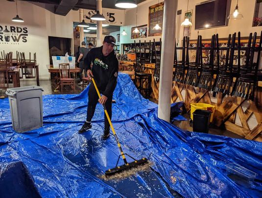It remains to be seen if Boards and Brews can reopen on Tuesday for the weekly meetup night, as the buildingโs landlord told Tufts that professional cleanup crews will not be available until at least Tuesday morning and his insurance company does not have a 24-hour support line. Until then, he and his fellow co-owners and staff were doing the best they could to clean up on Tuesday night, with dehumidifying efforts beginning later in the evening.