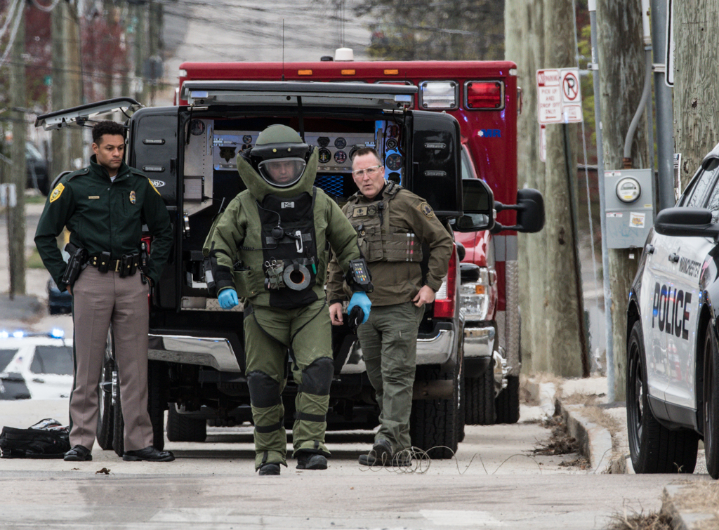 A member of the bomb squad examines the remnants of the detonated device outside the classical building at Central High School. Photo/Jeffrey Hastings