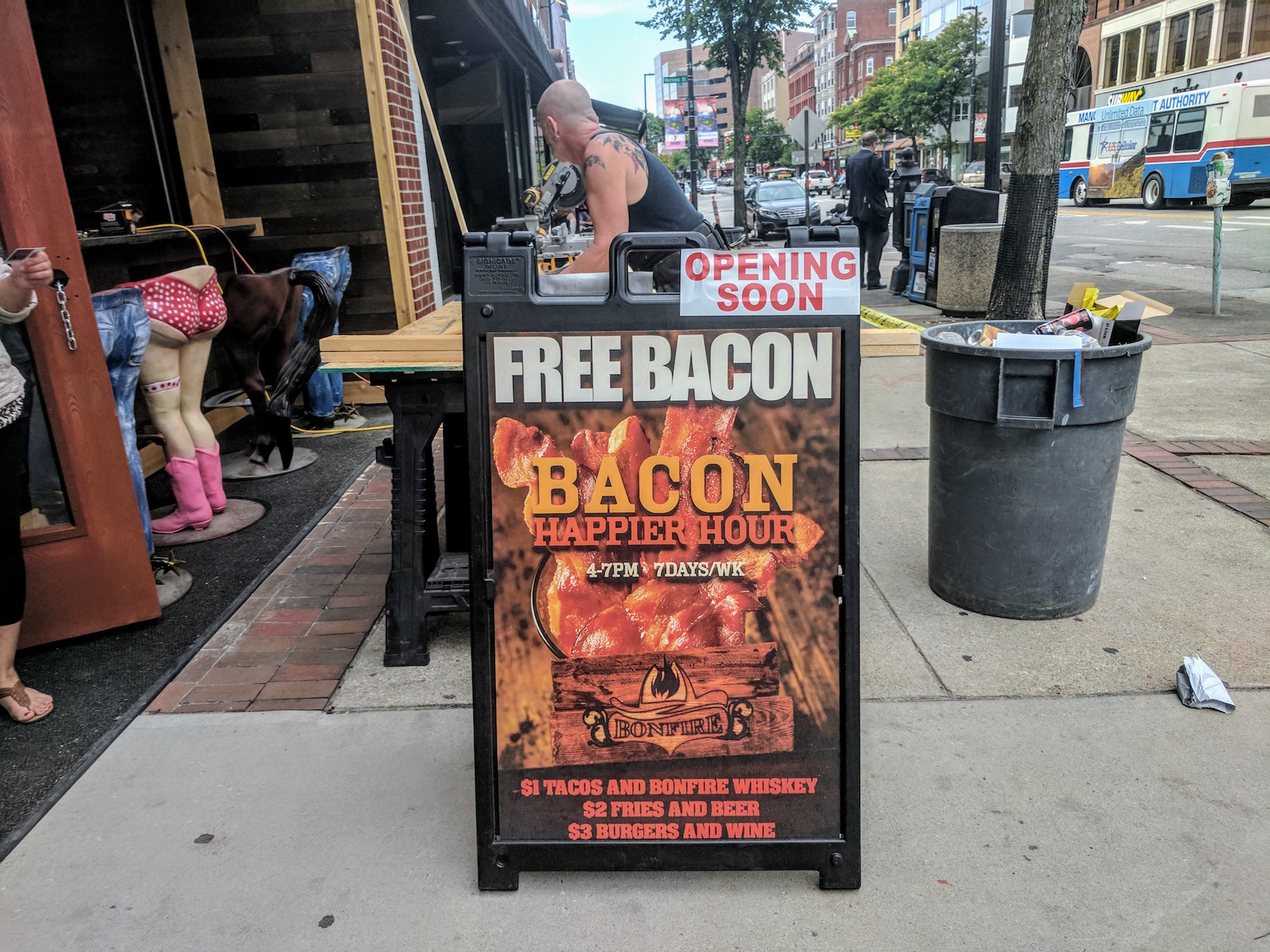 And if the country music or the suspended wooden porch swings don’t do it for you, it’s likely the free bacon will: Bonfire offers a “Free Bacon” Happy Hour seven days a week from 4-7 p.m.