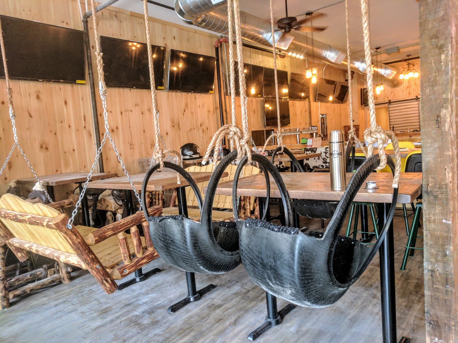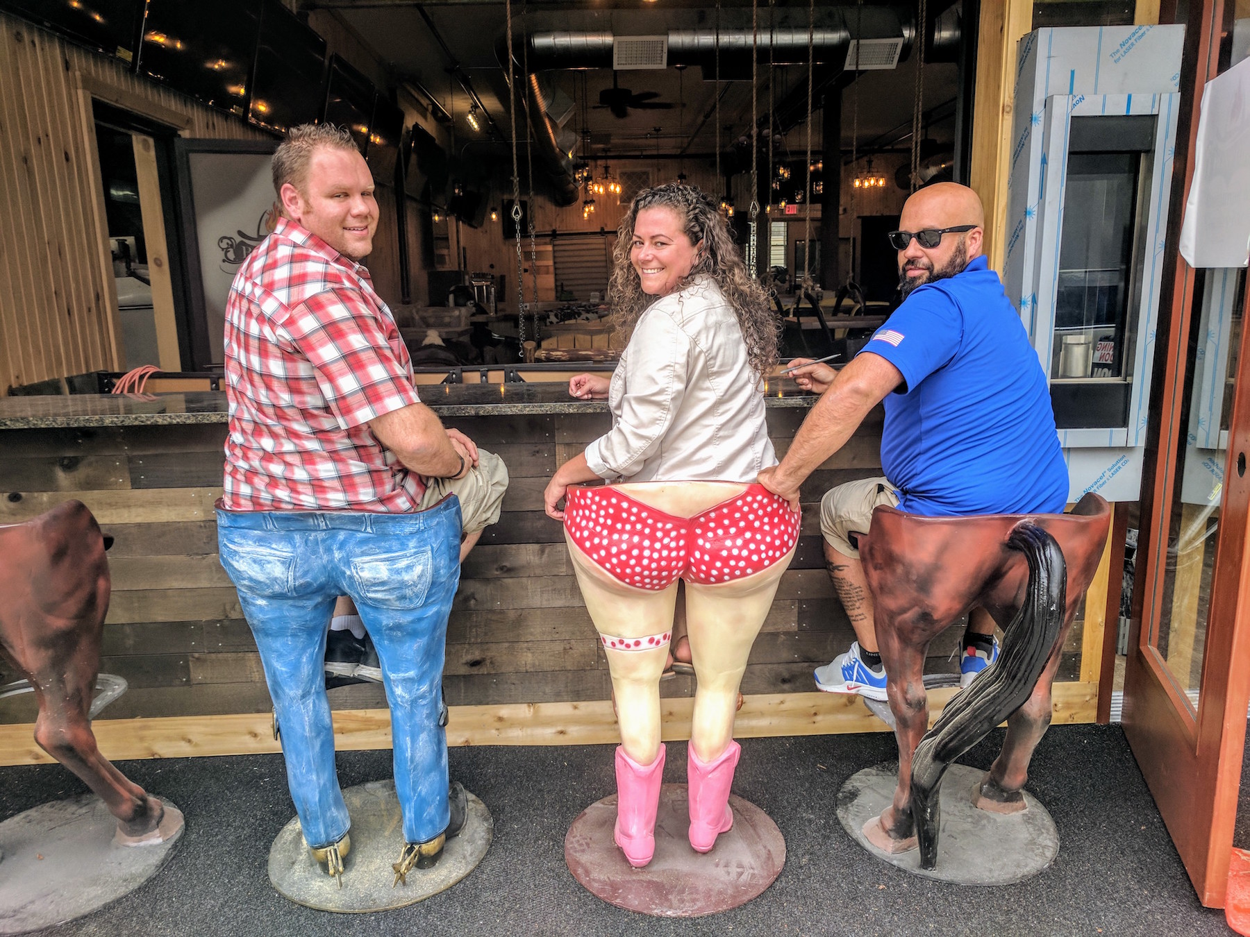 A carpenter was working out on the sidewalk slicing boards with a table saw, and the entire front of the rustic-looking watering hole is currently exposed, windowless and already equipped with comical barstools for the outdoor bar seating, which resemble the bottom half of a cowboy with spurs, a fat-bottomed girl in Daisy Dukes, and a horse’s tail end. Passers-by can stop and stare, or step inside for a look at the lay out โ or to ask a few questions, if they’re curious.