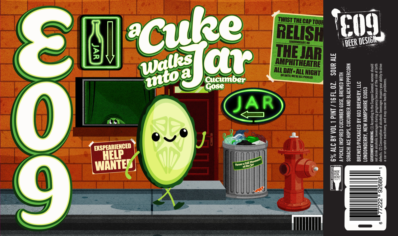 First is E09 A Cuke Walks Into a Jar (6 percent). This pickle-inspired cucumber gose is brewed with Sorachi Ace hops, fresh cucumber and black peppercorn. Itโs available on tap at the beer hall, and in the general market.