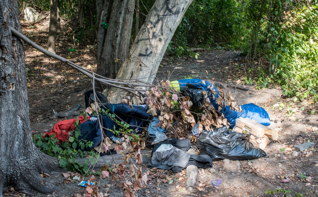 This area with brush had previously been cut down and the homeless camps removed. At this time it appears with the brush grown back the area has been reoccupied.