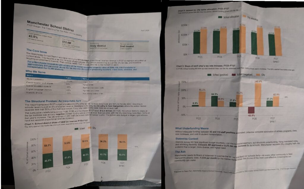 Two of Manchesterโs State Representatives, Democrats Suzanne Chretien and Erin Kerwin, urged for the city to step up on school funding after their fears that the state government is unlikely to support the city in the near future. Several students voiced the desire for investment in their futures, urging action on cleanliness in the cityโs schools and warning that a lack of investment in education would lead to an exodus of young people in the future. Others echoed the studentsโ statement regarding the cityโs future, asking Ruais to provide more of a vision into how improve the city and several parents voiced their support for greater investment in education.