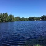 Based on visual evidence, the cyanobacteria bloom is accumulating in coves throughout the pond appearing as dark blue-green globs.
