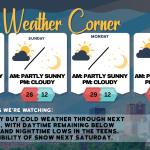 read more…: Weekend weather: Cold and windy, high temps below freezingThe first weekend of 2025 will be very cold and windy, with temperatures dipping into the teens and only reaching the upper 20s at best. The wind chill will create an even harsher feel, making it seem like it’s in the teens. Prepare accordingly!