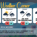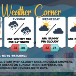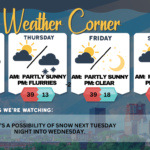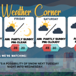 Expect colder temperatures today, with intermittent light snow and flurries throughout the morning. Accumulation from last night and this morning’s snowfall is predicted to total between 3 to 5 inches. As the day progresses, conditions will shift to areas of drizzle during the afternoon. The high temperature is expected to reach 34 degrees, though it will feel more like 29 degrees due to wind chill. Winds will be coming from the northeast at a gentle speed of 5 to 10 miles per hour. Please be cautious while traveling in slippery conditions.