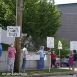 More than 80 people turned out along Beech Street Sunday morning to protest the barriers the Catholic Diocese of Manchester has erected against the renovation of the Chandler House, a 150-year-old mansion at 147 Walnut St., adjacent to the Hedwig Church.
