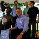 Despite Saturday’s extreme heat more than 50 people and at least three friendly dogs crowded under a popup tent set up in Arms Park Saturday afternoon to celebrate video-game pioneer Ralph Baer’s 100th birthday and to rededicate a statue there in his honor.