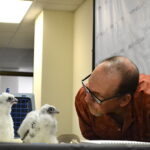 About 30 members of the public watched from the edge of their seats Tuesday morning as New Hampshire Audubon biologist Chris Martin applied bands to the legs of four peregrine falcon chicks, also known as eyasses.