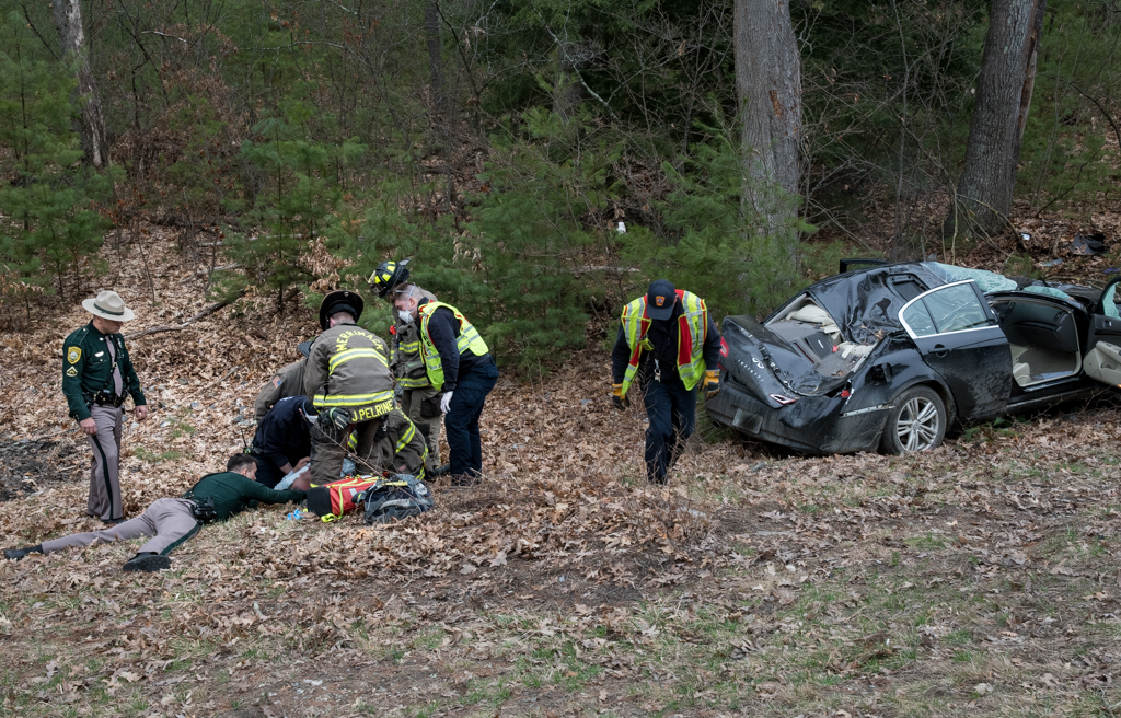 Merrimack Fire-Rescue units arrived and began to provide medical assistance to the victim and requested a trauma alert at a Nashua hospital. Additional Merrimack firefighters searched the woods in the area to verify there were no victims that may have ejected from the car.