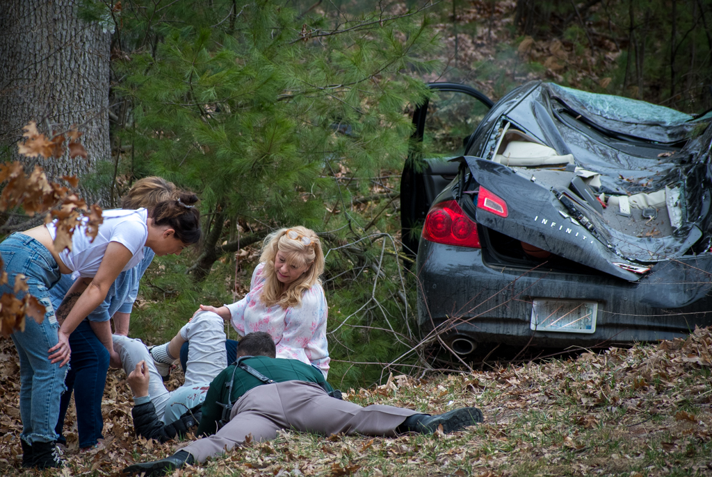 On arrival, the sedan was located down the embankment with serious damage, by Trooper Timothy Repucci, and the driver was pinned inside the vehicle. Trooper Repucci immediately called for Merrimack Fire and worked to remove the driver with the assistance of others who stopped at the crash scene. ย The victim was removed and Trooper Repucci laid on the ground holding the victimโs head to keep him stable. Other people at the scene used a fire extinguisher on the smoking vehicle.